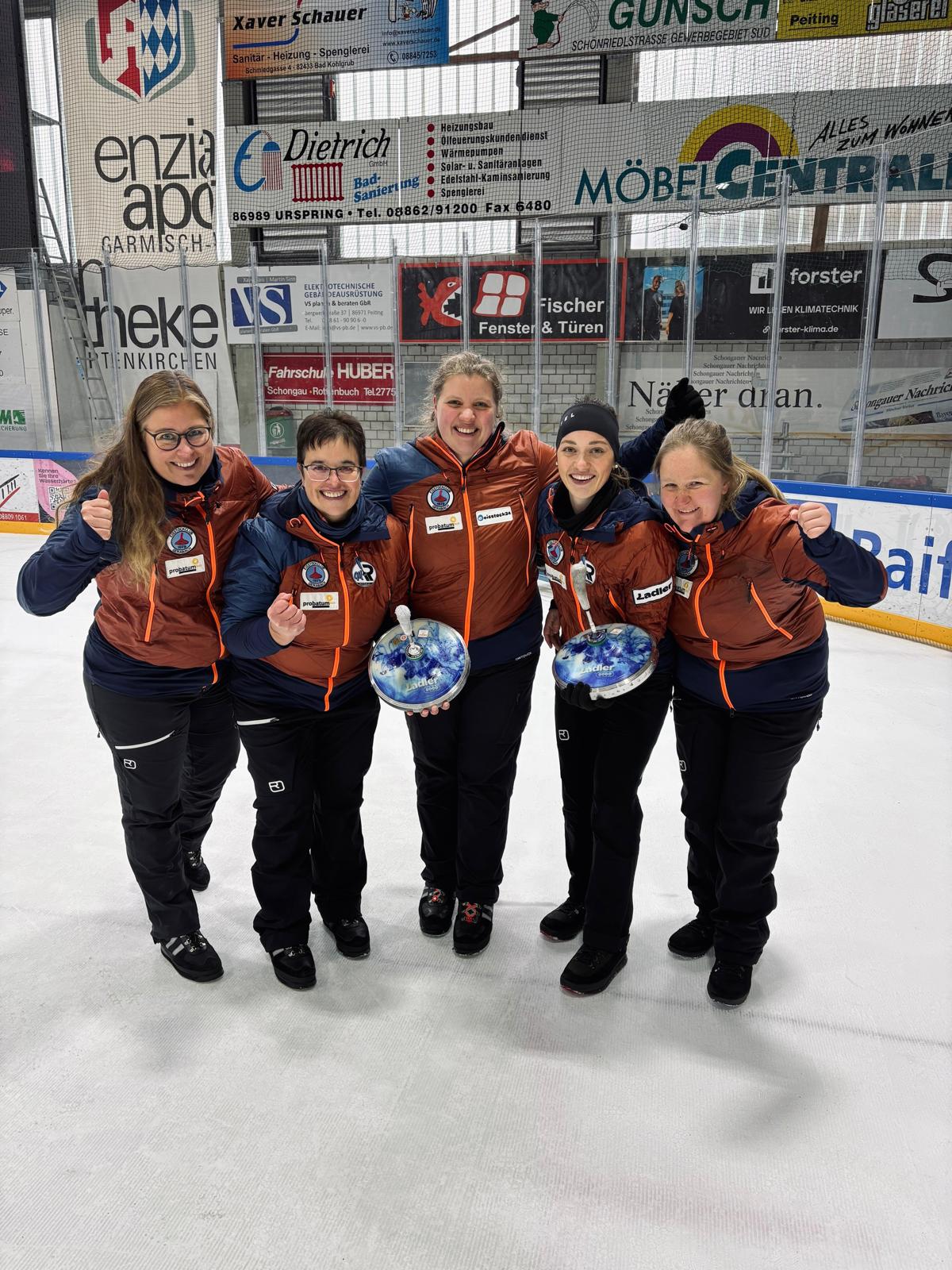 Der Trip nach Ruhpolding hat sich voll und ganz rentiert! Das Damenteam vom EC Gerabach gewann bei der Deutschen Meisterschaft den Titel. Die Damen präsentierten sich in glänzender Form. Monika Goderbauer, Alina Mayer, Regina Rappp und Raphaela Meier sammelten in der Qualifikationsrunde stattliche 19:1 Punkte und verwiesen TSV Peiting (15:5), TSV Kühbach (3.) und SV Gumpersdorf (beide 14:6) auf die Plätze. Mit einem zähen 4:3 gegen Peiting zog Gerabach auf direkten Weg ins Finale ein und lieferte sich dort ein prickelndes Duell mit Kühbach, das sich mit Erfolgen über Gumpersdorf (5:4) und Peiting (5:3) qualifiziert hatte. Nach zwölf Kehren behielt die Moarschaft des EC Gerabach gegen die Schwaben hauchdünn mit 10:9 (8:4/2:5) die Oberhand und jubelte über den verdienten Meistertitel.