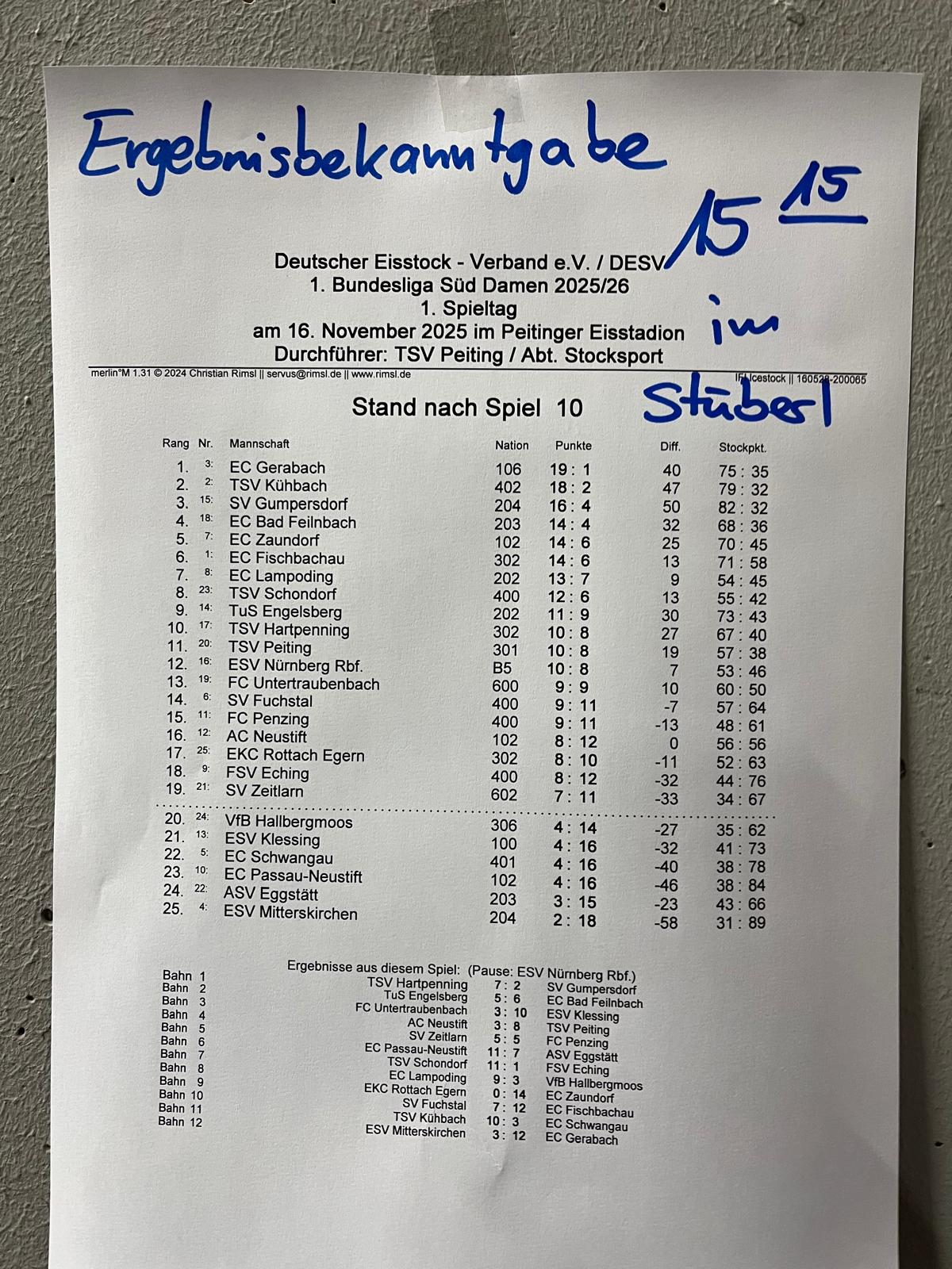Bei der Bundesliga Vorrunde, die am 26.11. in Waldkraiburg ausgetragen wurde, erwischten die Damen des EC Gerabach einen Traumtag und führen die Liga nach 10 Spielen mit 18:2 Punkten an. Eher schlecht lief es bei den Herren, deren Vorrunde am 09.12. in Ruhpolding ausgetragen wurde, und sich mit 9:15 Punkten auf Platz 22 befinden.