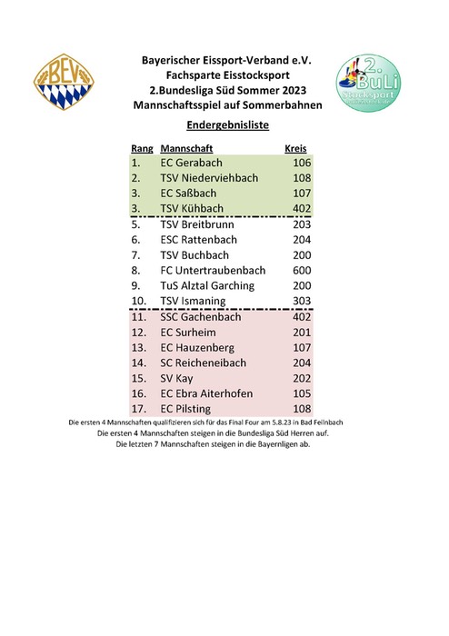 Am 5. August findet dann noch ein Wettkampf mit allen Aufsteigern statt. Im „Final Four“ wird neben dem EC.Gerabach, dem TSV Niederviehbach, EC. Sassbach und dem TSV Kühbach dann in Bad Feilnbach der Gesamtsieger der 2. Bundesliga ermittelt.