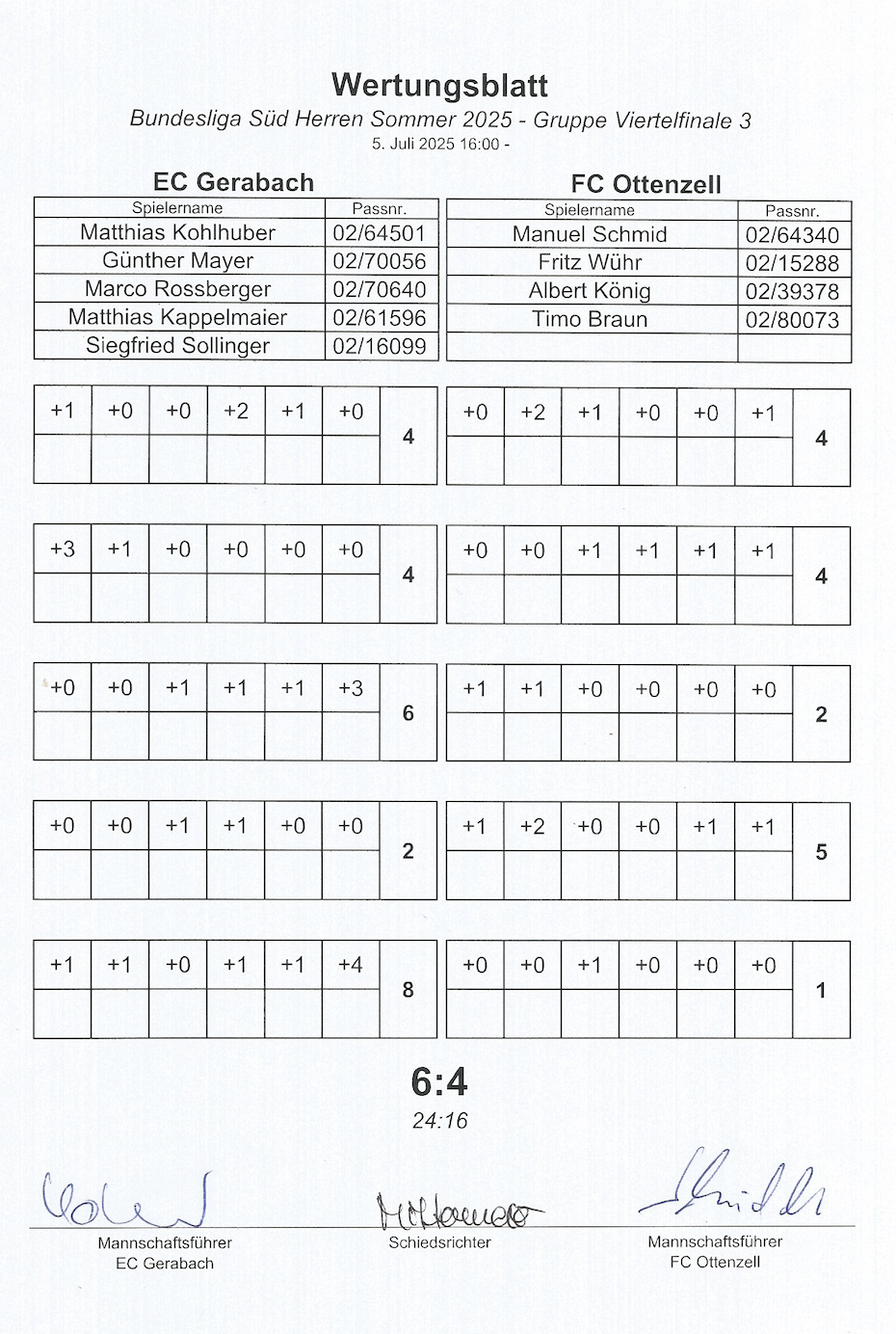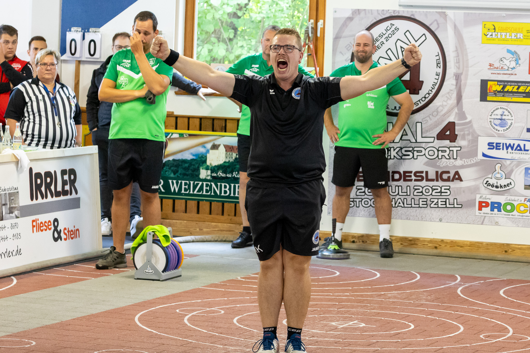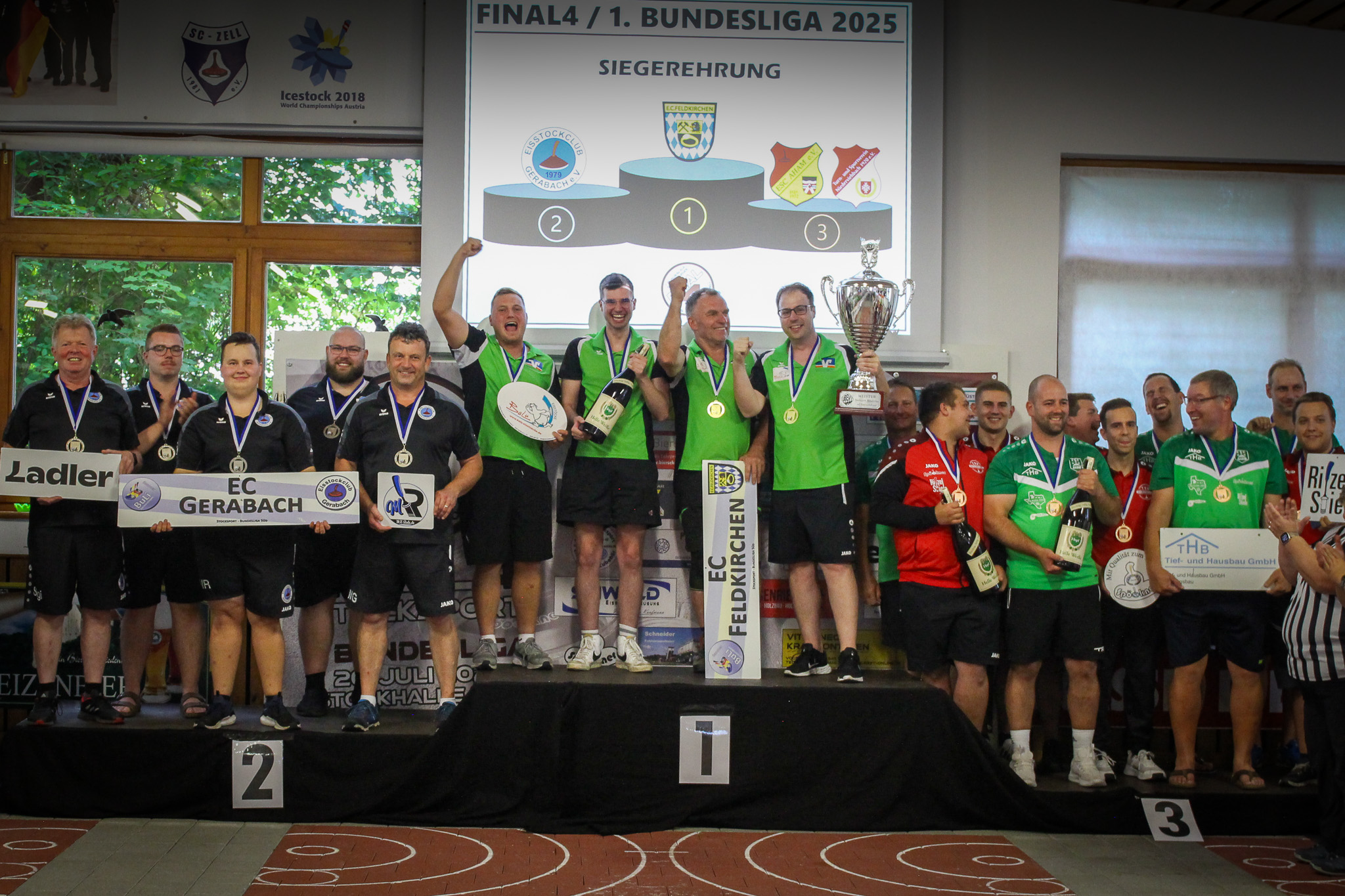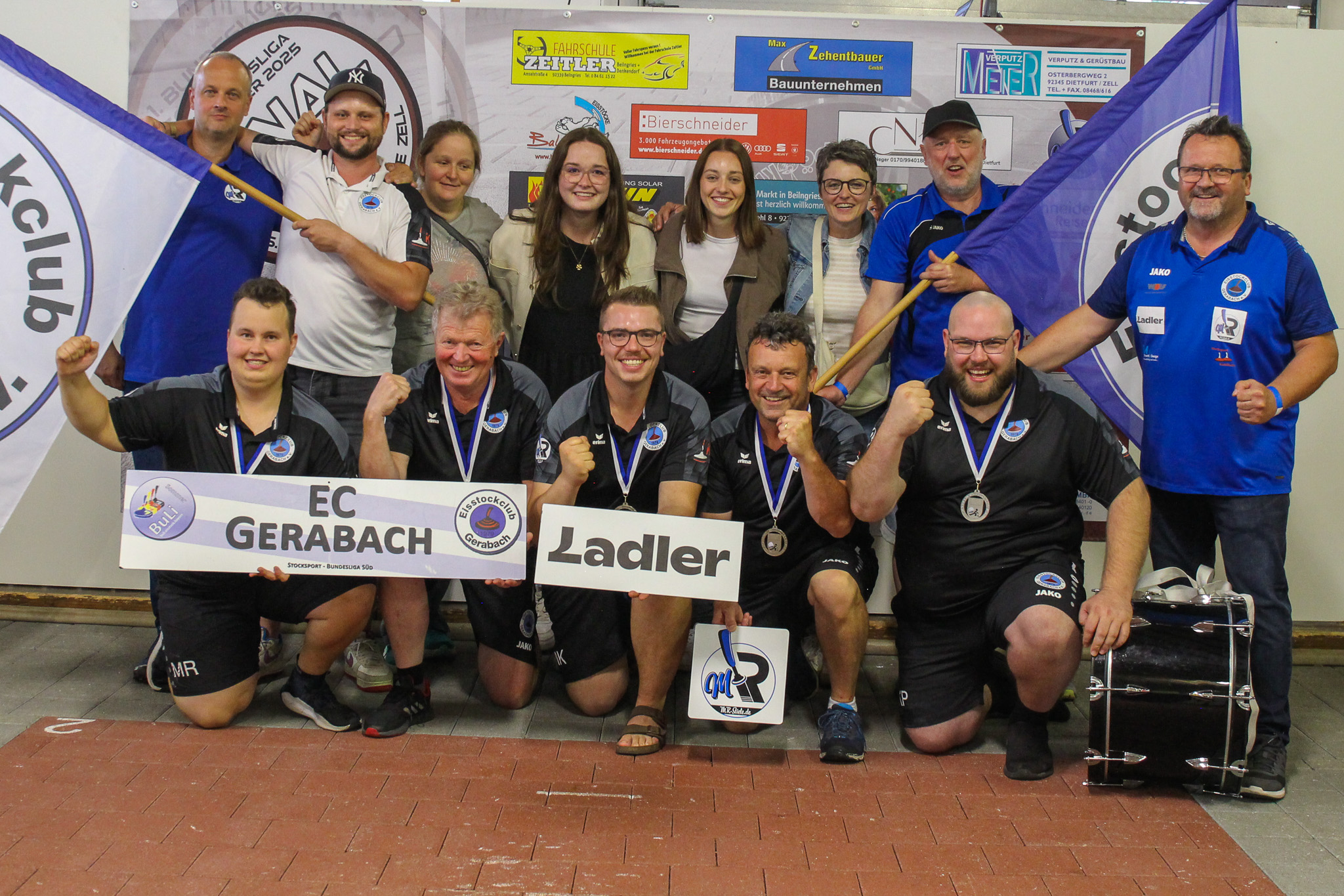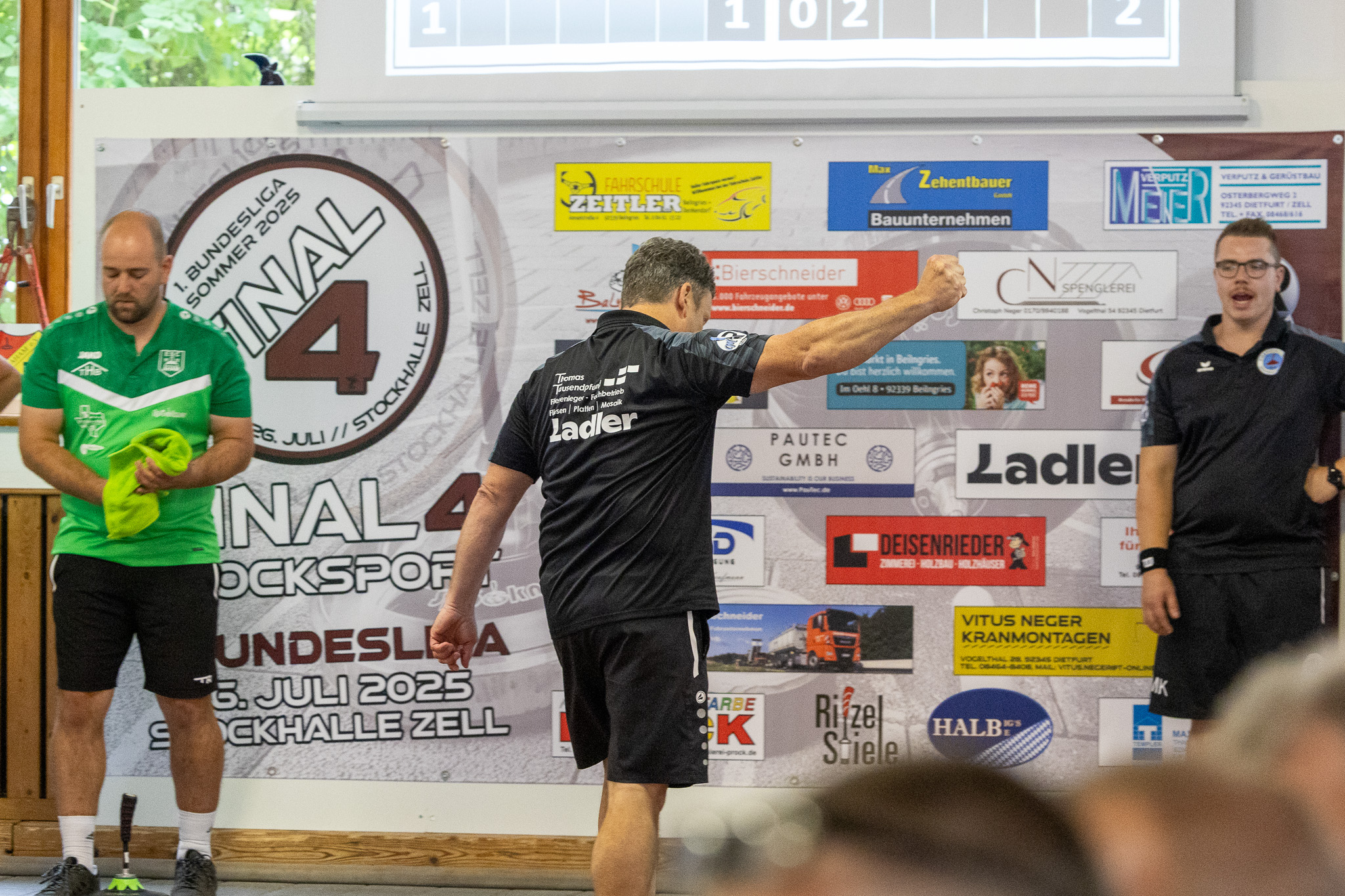 Ein wahrer Krimi spielte sich am Samstag in der Stockhalle des Eisstockclub Gerabach ab. Zum Viertelfinalspiel in der 1. Bundesliga Süd reiste der FC Ottenzell als Zweiter der Gruppe B, in die vereinseigene Halle an. Nach 2 Stunden Einspielzeit und der offiziellen Begrüßung pfiff Schiedsrichterin Claudia Mittermeier den Wettkampf pünktlich um 16.00 Uhr an. Günther Mayer, Matthias Kappelmaier, Matthias Kohlhuber und Marco Rossberger hatten sich unter der Woche akribisch auf den starken Gegner eingestellt und nochmal genau analysiert. Ein ausgeglichenes Bild zeigte sich dann nach dem ersten Spiel, dass 4:4 Unentschieden endete. Ebenfalls auf Augenhöhe begegneten sich die Teams im Spiel 2. Wieder endete es leistungsgerecht 4:4. Dann nach der Pause zeichneten sich die Gerabacher mit einer starken Leistung aus und holten sich mit 6:2 Punkten zwei Zähler. Der FC Ottenzell konnte aber dann im vierten Spiel zurückschlagen und sicherte sich zwei wichtige Punkte zum erneuten Ausgleich. So musste das letzte Spiel die Entscheidung um den Gesamtsieg bringen. Dann aber eine Hiobsbotschaft im Lager des EC Gerabach. Aufgrund einer Verletzung am Oberarm, konnte der Angriffsschütze Matthias Kappelmaier den Wettkampf nicht mehr fortsetzen. So kam schließlich Siegfried Sollinger zu seinem unerwarteten Spieleinsatz. Nach einer kurzen Einspielzeit übernahm er die Position des Moars und auch der Rest des Teams musste leicht umgestellt werden. Unbeirrt dessen zogen die Gerabacher aber weiter ihre Kreise und drückten den FCOttenzell immer weiter in die Defensive. Nach der 5 Kehre lag man im Endscheidungsspiel dann mit 4:1 in Front und es mussten nur noch zwei Stöcke entfernt werden. Dies übernahmen dann Matthias Kohlhuber und Günther Mayer in gekonnter weise und der Viertelfinalsieg war somit unter Dach und Fach. Bei der anschließenden Siegesfeier wurde dann schon fleißig über das anstehende Final Four Finale in Zell am 26. Juli 2025 diskutiert. Hier trifft der Eisstockclub Gerabach auf den ESC Aham, der wiederum den EC.Passau Neustift im Parallelspiel mit 7:1 Punkten ausschaltete. Zugleich bedeutet dieser Erfolg über den FC Ottenzell die Teilnahme an der Deutschen Meisterschaft.