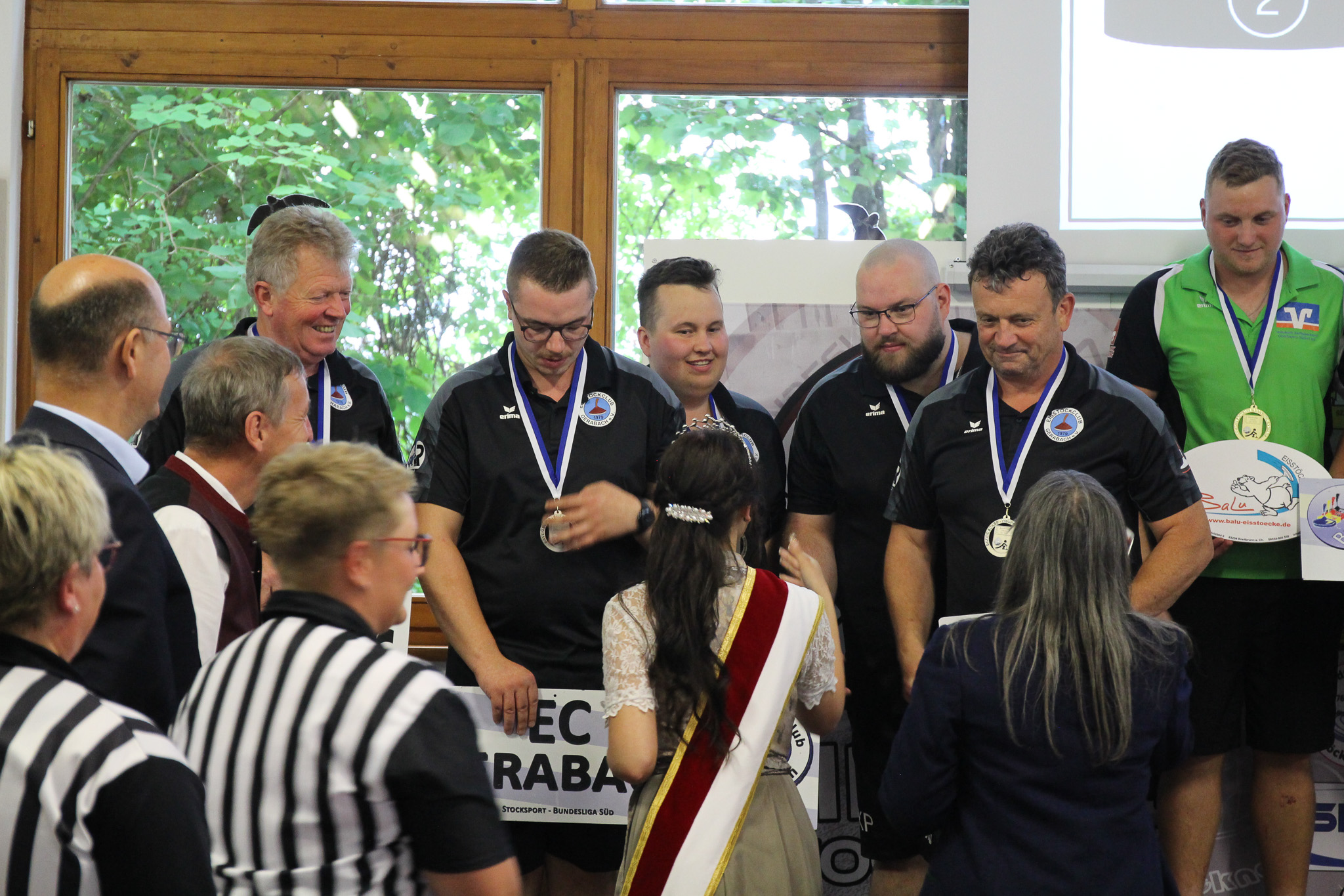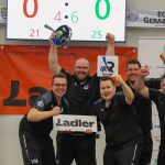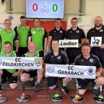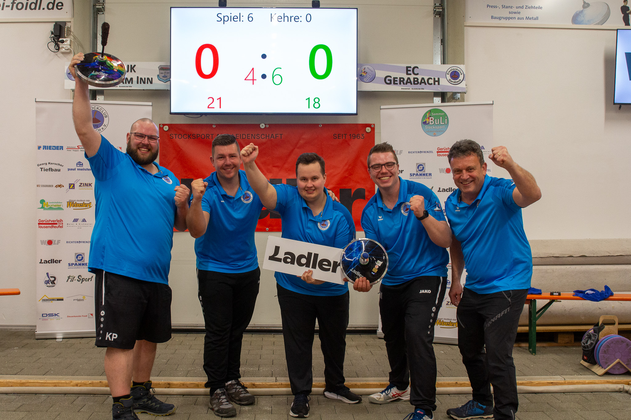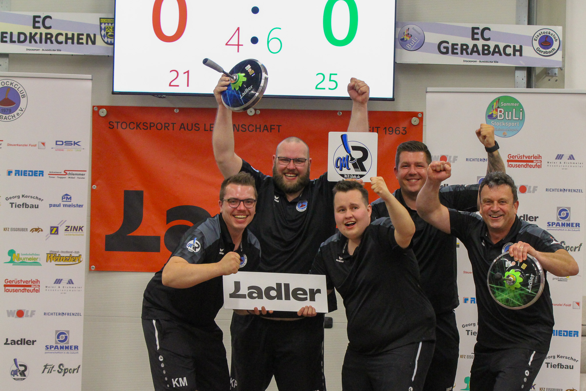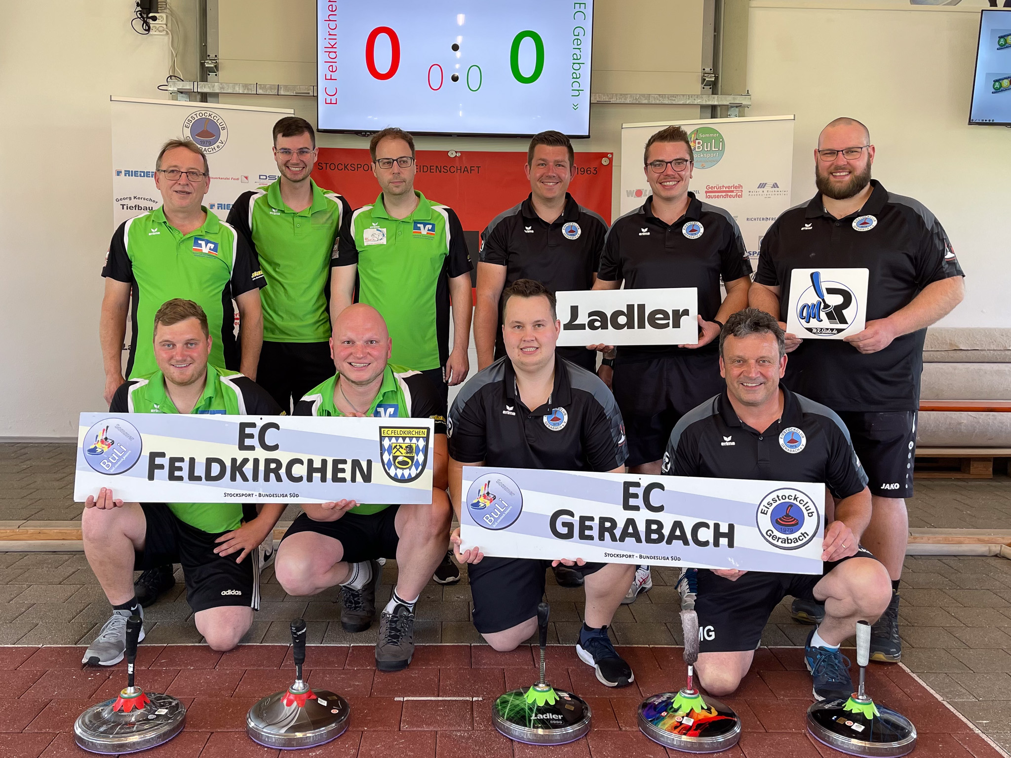 Zum Bundesligawettkampf, Erster gegen Zweiter, empfing der Eisstockclub Gerabach am Samstag das Team des EC Feldkirchen zum Heimspiel der Gruppe C in der vereinseigenen Stockhalle. Die Mannen um Günther Mayer, Andreas Bruckner, Matthias Kappelmeier, Matthias Kohlhuber und Marco Rossberger gingen dabei voll motiviert in das Spiel, da man gegen Feldkirchen die einzige Niederlage in der Vorrunde einstecken musste. Die Fans, die zahlreich angereist waren, sahen anfangs ein Spiel auf Augenhöhe und so trennte man sich im ersten Spiel leistungsgerecht 5:5 Unentschieden. Das Spiel vor der Pause konnte der ECG dann mit 6:4 Punkten für sich entscheiden. Auch danach blieben die Gerabacher voll konzentriert und holten sich Durchgang 3 mit 8:3 Punkten. So lag man zwischenzeitlich mit 5:3 in Führung. Das Team aus Feldkirchen konterte aber und holte sich mit 6:3 Punkten das vierte Spiel. So musste der letzte Durchgang über Sieg oder Unentschieden für Gerabach entscheiden. Wieder wurde Stocksport vom Feinsten gezeigt und die Spannung in der Halle war am Siedepunkt. Die Heimmannschaft lag bis zur fünften Kehre knapp mit 3:2 Punkten in Front. Den letzten Anschluss, den Feldkirchen setzen musste, eliminierte der Angriffsschütze der Gerabacher Matthias Kappelmeier in bester Manier. Ein klasse Eindreher bereitete den Gerabachern dann noch etwas Probleme, diese wurden dann aber mit zweit tollen Schüssen gelöst. Auch Feldkirchen kontere nochmals und entfernte den Stock vom EC Gerabach. Der finale Schuss lag dann bei Marco Rossberger. In der Halle war es totenstill als der Moar der Gerabacher die schnelle grüne Platte aufschraubte. Ein gezielter strammer Schuss traf das anvisierte Ziel und sofort war Riesenjubel in der Stockhalle zu hören. Zwar erreichten die Gäste noch ein 3:3 Unentschieden, der Gesamtsieg ging aber mit 6:4 Punkten an Gerabach. Vor dem letzten Spiel am kommenden gegen die DJK Aign am Inn, steht Gerabach schon als Gruppensieger fest. Wer der Viertelfinalgegner im Heimspiel am 5. Juli ist, wird noch ermittelt. Dieser wird dann der Zweite der Gruppe B sein.