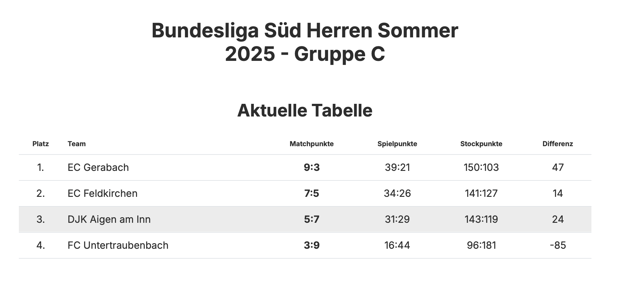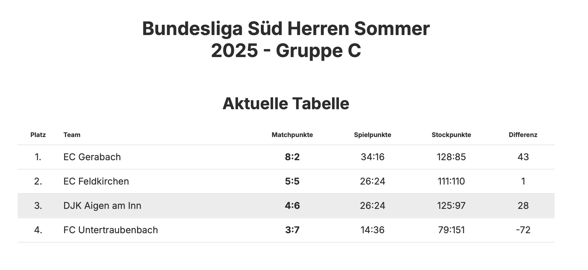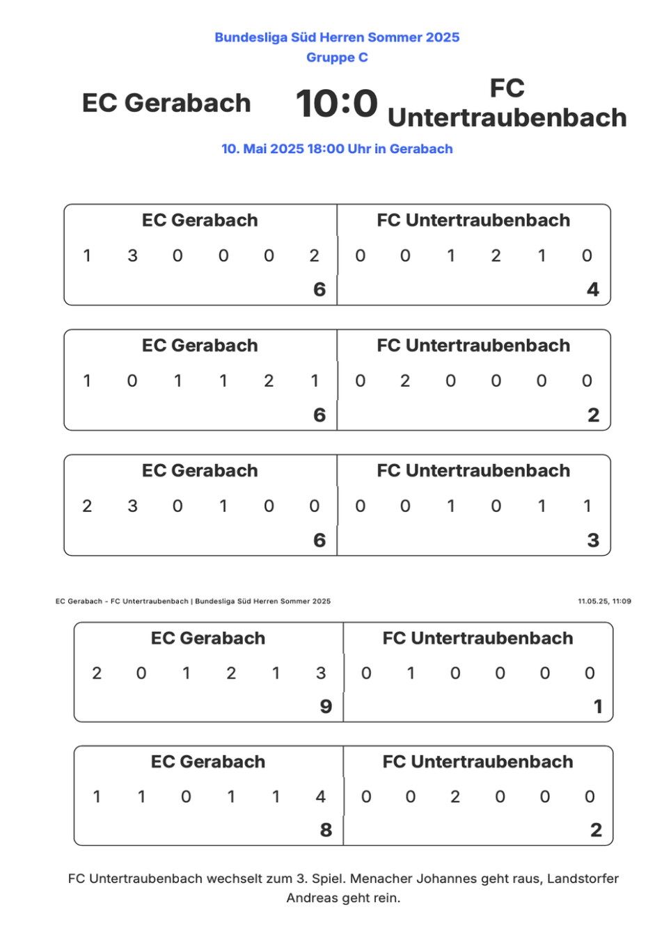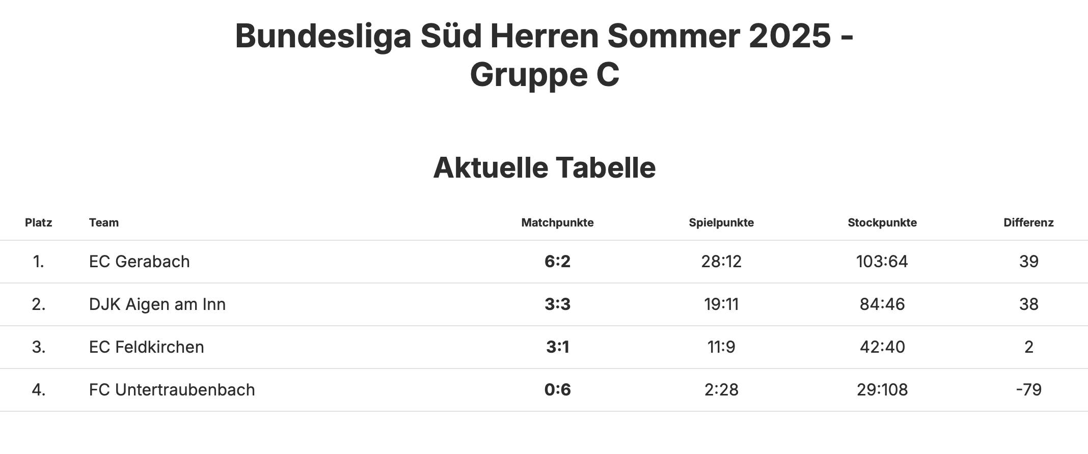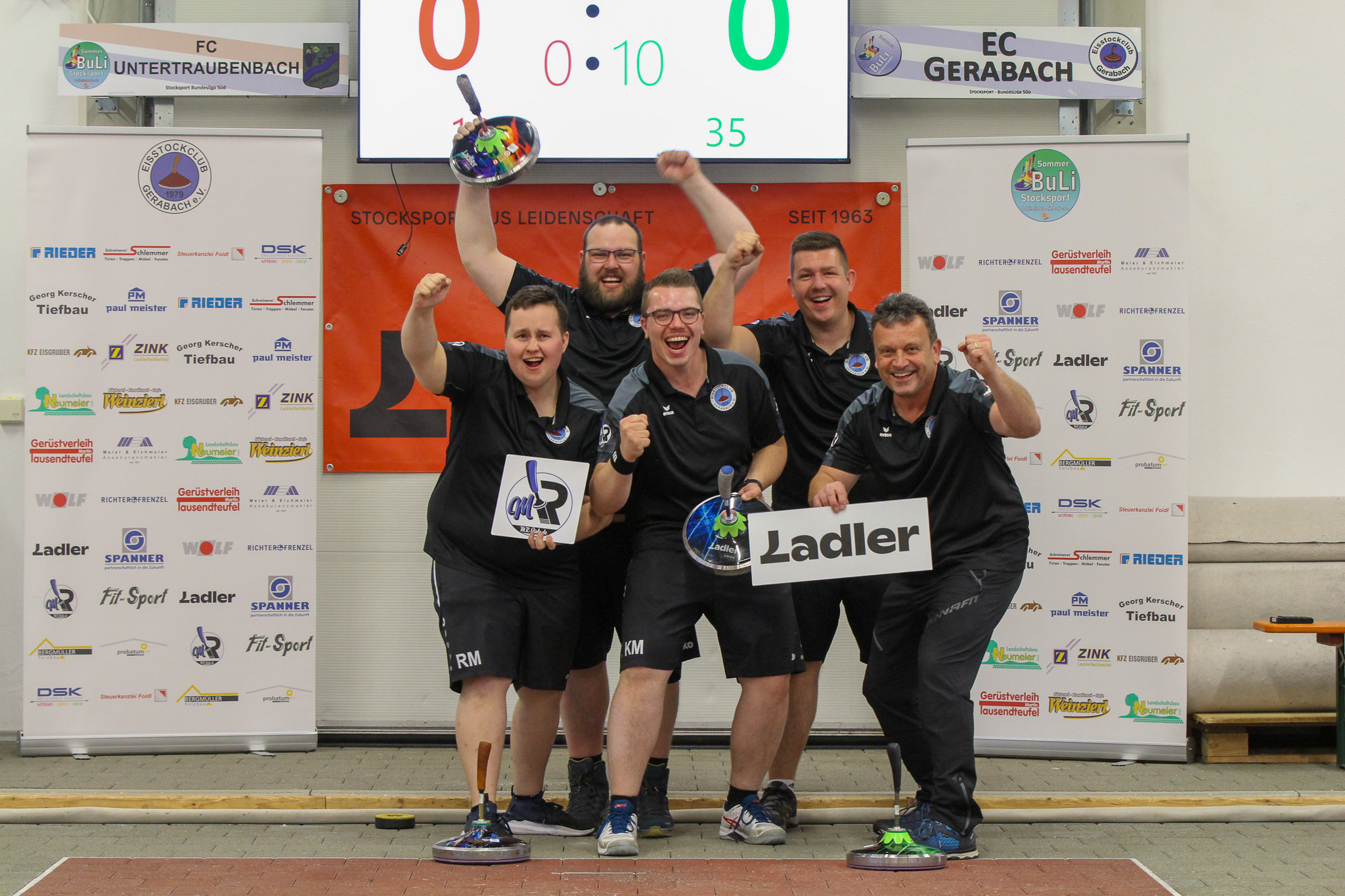 Exakt eine Woche nach dem 8:2 Auswärtssieg gegen den FC Untertraubenbach fand das Rückspiel am Samstag in der Stockhalle des EC Gerabach statt. Die Gäste, wollten sich mit einer etwas umgestellten Mannschaft für die klare Niederlage revanchieren. Das Gerabacher Team um Günther Mayer, Andreas Bruckner, Matthias Kohlhuber, Matthias Kappelmeier und Marco Rossberger lies sich aber davon nicht beeindrucken und ging recht selbstbewusst in den Bundesligawettkampf. So gingen die beiden ersten Spiele mit 6:4 und 6:2 Punkten an die Hausherren. Auch nach der Pause hatte der EC Gerabach das Spiel weiter im Griff. Mit 6:3, 9:1 und 8:2 Punkten gelang der 10:0 Heimsieg und das Team führt weiterhin die Tabelle der Gruppe C an. Spieler aber auch Fans waren von der Klassevorstellung sehr begeistert und fiebern schon der Partie gegen den EC Feldkirchen entgegen.Hier musste der EC Gerabach eine knappe 4:6 Niederlage einstecken und hat somit noch eine Rechnung offen. Das Spiel findet am 31. Mai um 18.00 Uhr in der EC Stockhalle statt.